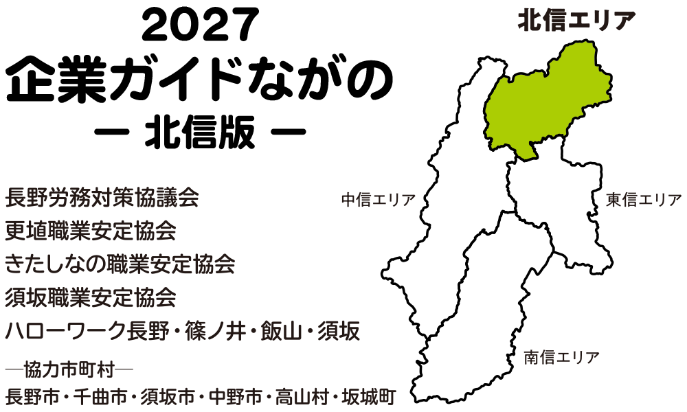 この「2027企業ガイドながの北信版WEB」は、学校を卒業して初めて就職しようとする学生の皆さんが、企業を選択する際の参考にしていただくため、長野県の北信地域に関係する主要企業の事業内容を、詳しく掲載したものです。 「イベント・セミナー情報」では、北信地域面接会の日程等も掲載しますので、こまめにご確認ください。