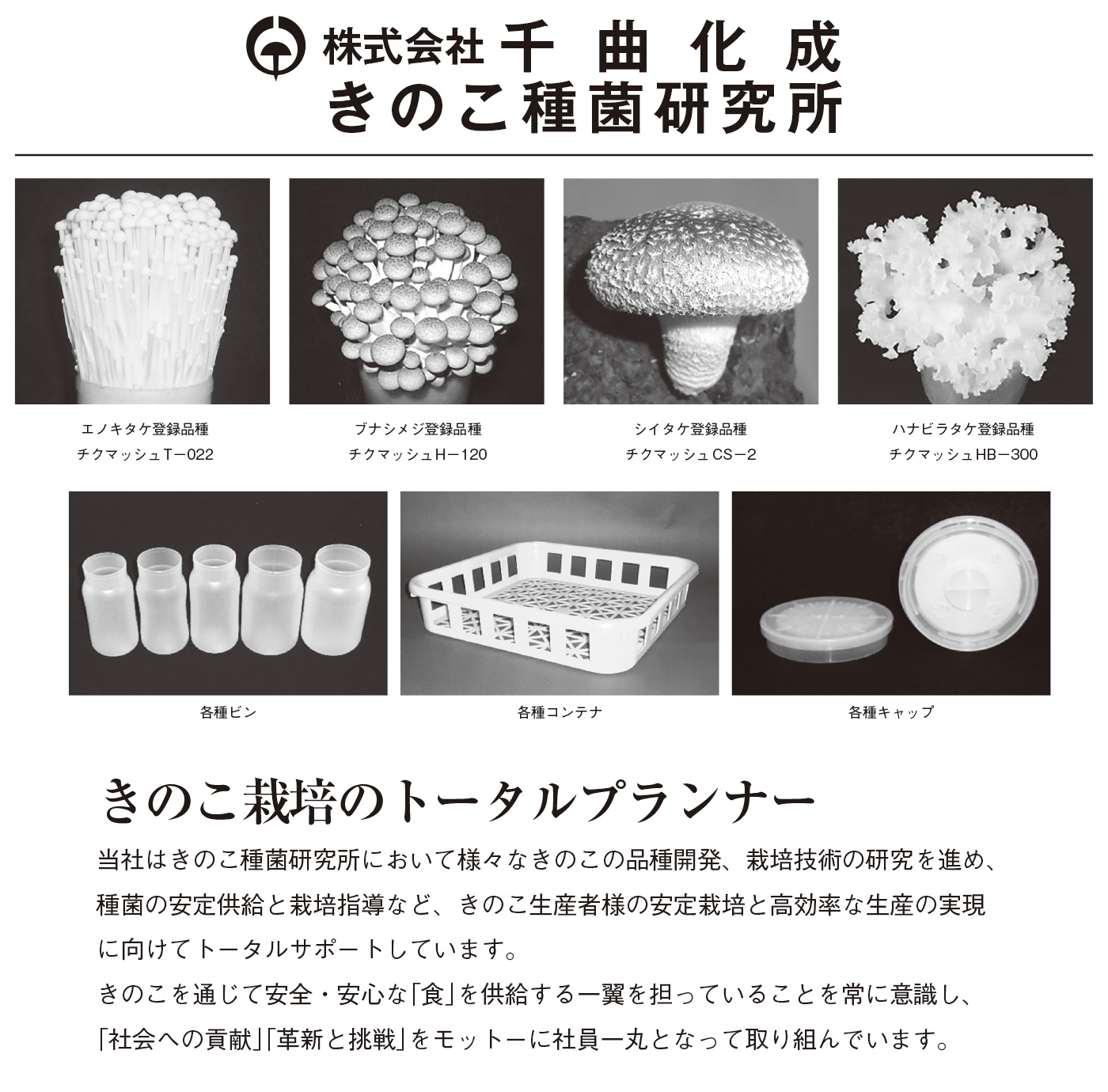 | 事業内容 | きのこ生産資材の製造、販売 各種きのこ種菌の研究開発及び製造、販売 各種きのこ栽培技術の開発と指導 環境機器の販売 家庭用プラスチック製品(灯油缶、水入缶、園芸用ジョロ等)の製造、販売、熱交換塗料の塗装施工 |