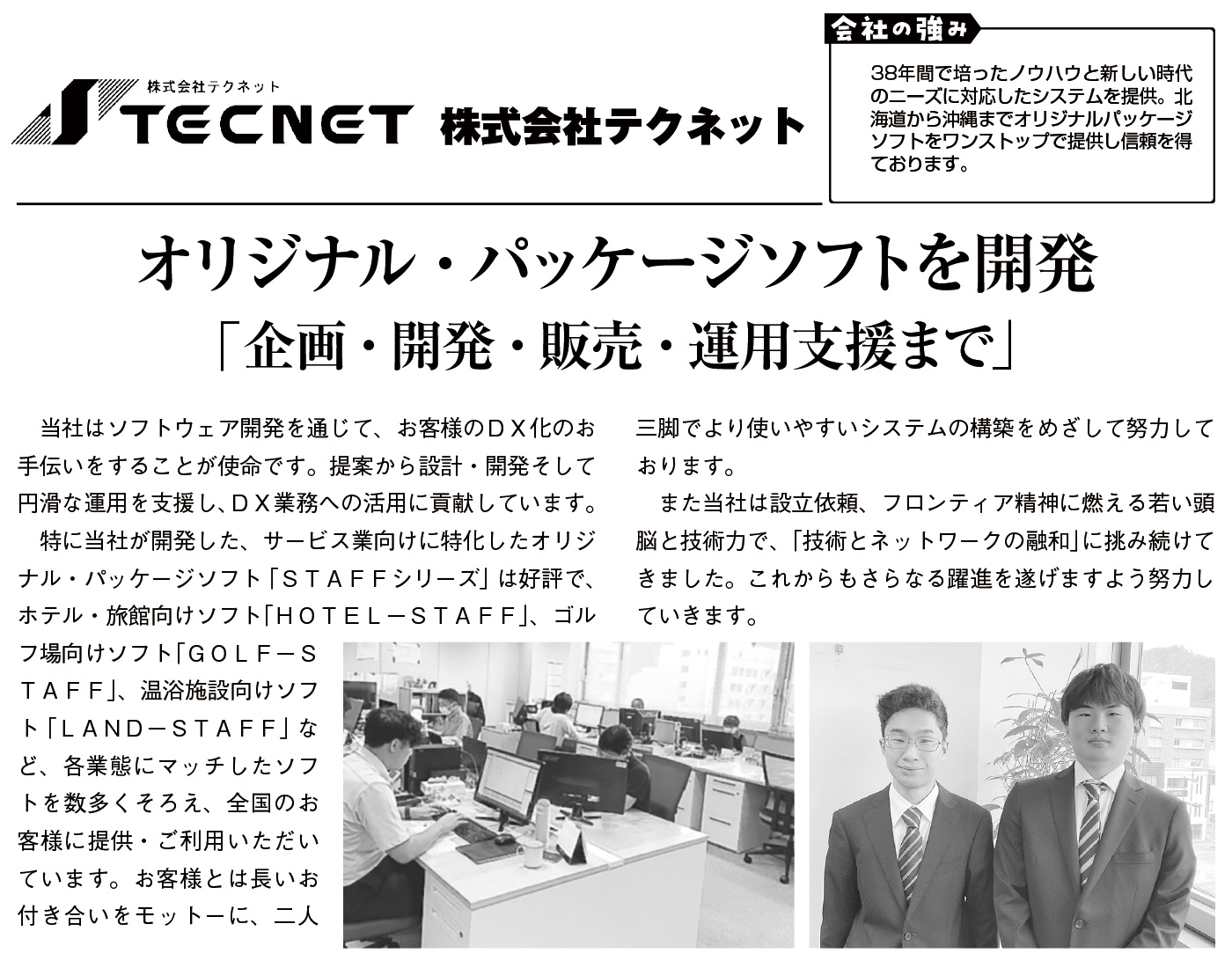 | 事業内容 | パッケージソフトウェアの設計開発及び販売 ・HOTEL-STAFF(ホテルシステム) ・BRIDAL-STAFF(婚礼システム) ・GOLF-STAFF(ゴルフ場システム) ・SHOP-STAFF(店舗管理システム) ・LAND-STAFF(温浴システム) ・レストランオーダリングシステム ・清掃末端 各種ソフトウェアの設計及び開発 ・生産管理システム ・販売管理システム ・人事管理システムほか ・Webアプリケーション ・HP作成 各種OA機器販売 |