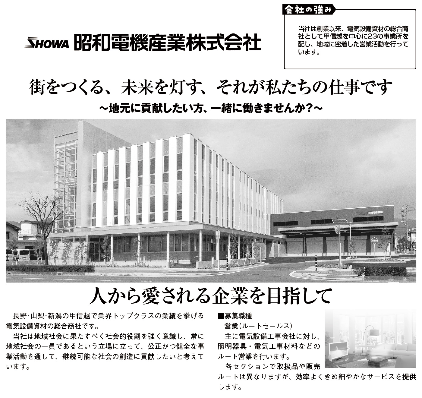 | 事業所 | 本社/長野市三輪荒屋1154番地 支店/長野・上田・佐久・松本・諏訪・伊那・飯田・上越・長岡・新潟・六日町・柏崎・三条・中津川・岐阜・東京・甲府・長野産業機器・松本産業機器・東信産業機器・長岡産業機器・新潟産業機器 |