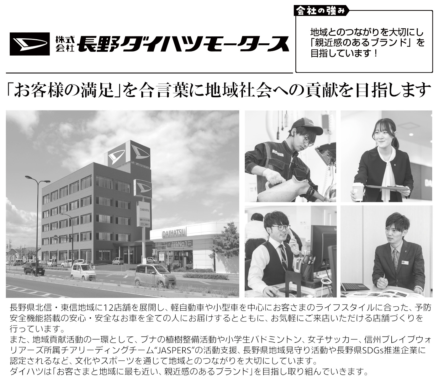 | 営業拠点 | 【店舗】 飯山店・中野七瀬店・須坂小山店 北長野店・稲葉店・川中島原店 千曲寂蒔店・上田常入店・上田原店 小諸インター店・佐久岩村田店 佐久臼田店 【センター】 部品センター・長野車検センター 上田車検センター・配車センター 中古車メンテナンスセンター |