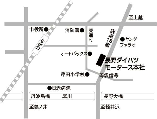 | 営業拠点 | 【店舗】 飯山店・中野七瀬店・須坂小山店 北長野店・稲葉店・川中島原店 千曲寂蒔店・上田常入店・上田原店 小諸インター店・佐久岩村田店 佐久臼田店 【センター】 部品センター・長野車検センター 上田車検センター・配車センター 中古車メンテナンスセンター |