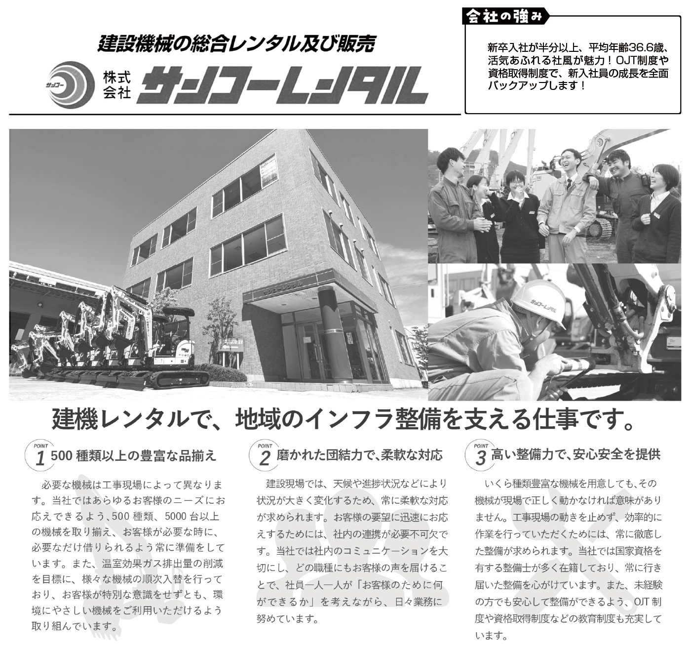 | 福利厚生 | 各種社会保険完備(健康・厚生年金・労災・雇用)・資格取得制度・社員旅行・借り上げ社宅制度・社内表彰制度・コミュニケーション手当 |