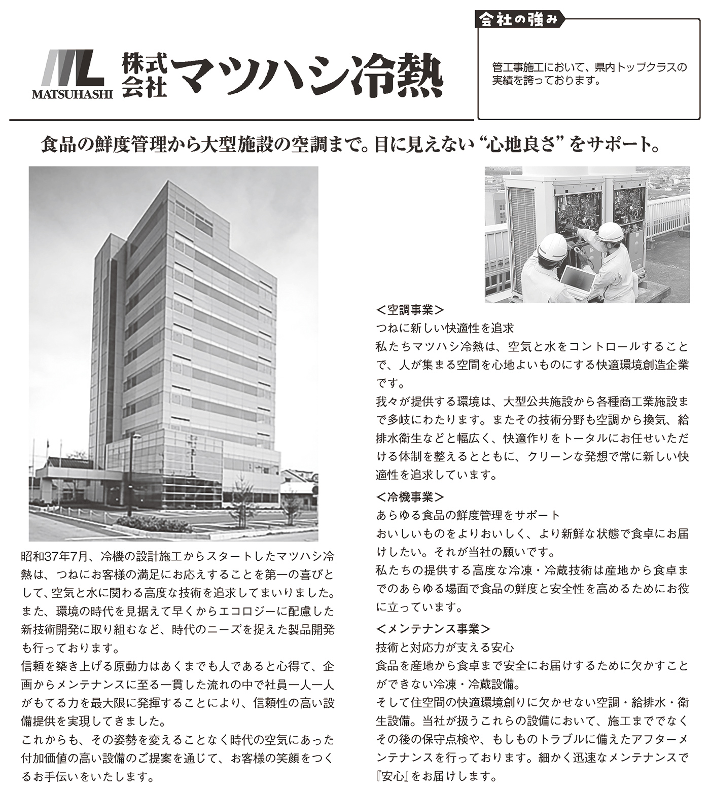 事業内容空調、給排水衛生設備、店舗冷凍冷蔵、菌茸類空調栽培設備 等、各種建設設備の設計・施工・修理、保守