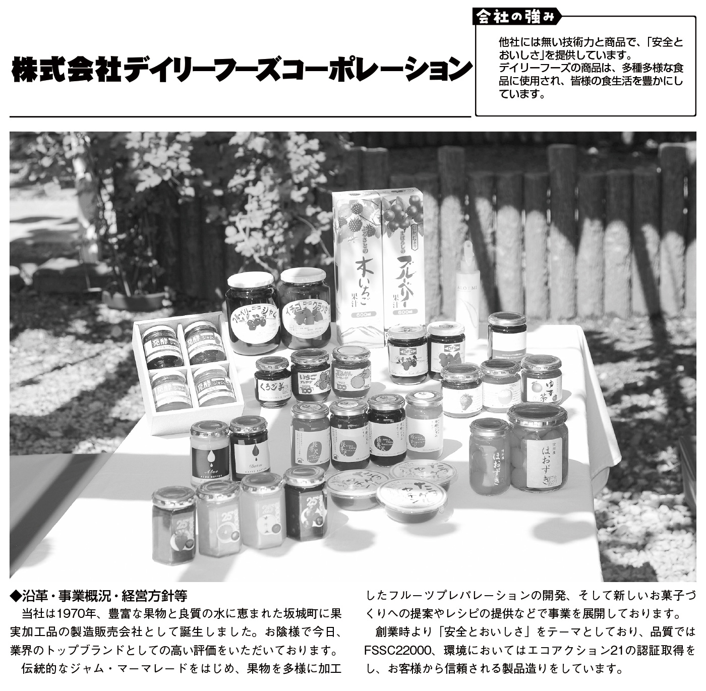ジャム、マーマレード、瓶缶詰、ジュース、フルーツプレパレーション、栄養補助食品等の製造販売、毛髪分析、種苗の育成・栽培、製薬