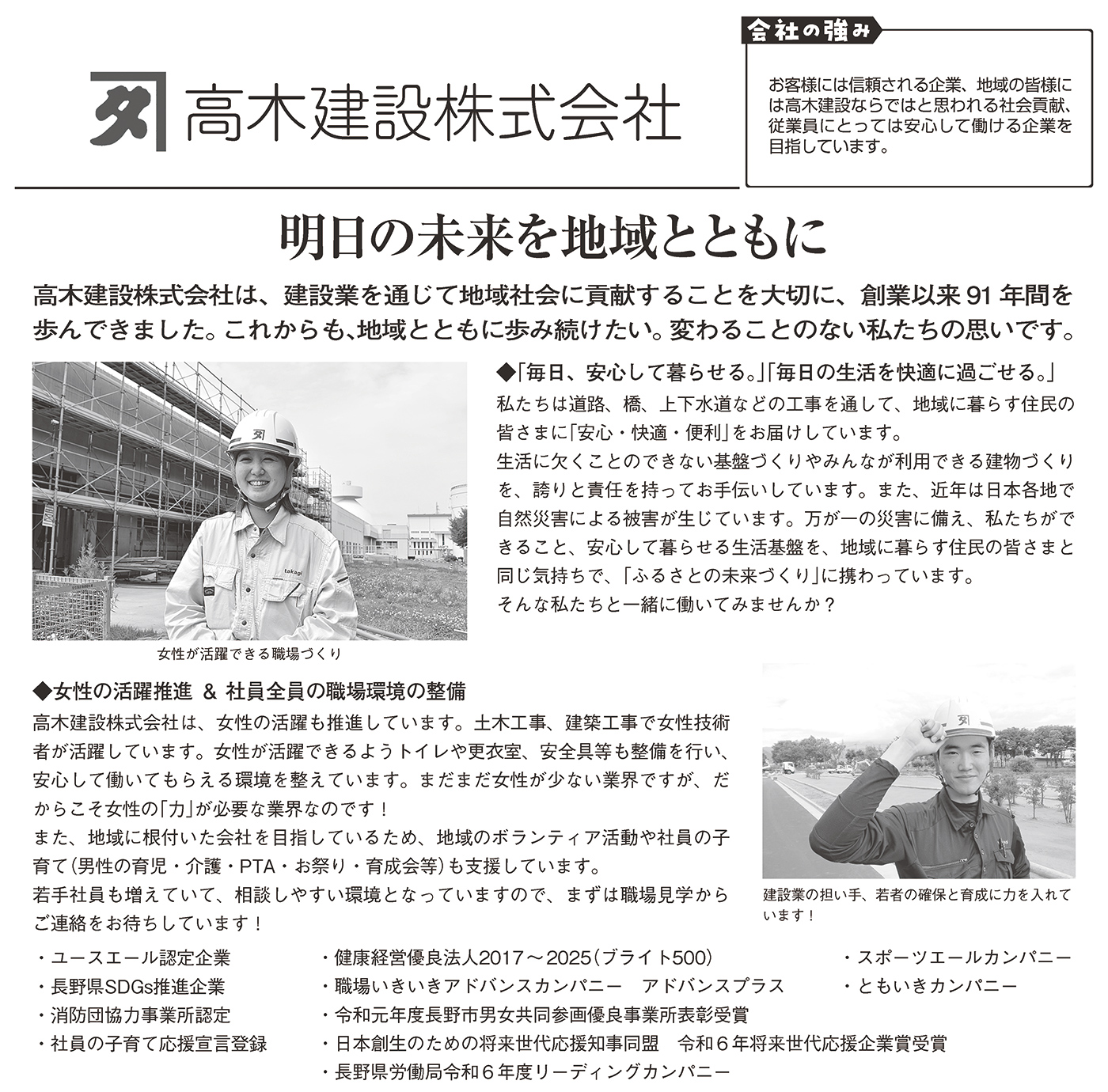 | 福利厚生 | 各種社会保険制度、退職金制度、財形貯蓄制度、表彰制度、クラブ活動(野球部、フットサル部、マラソン部等)、共済会制度(社員旅行、花見、暑気払い、忘年会等)、ユメワーク長野加入、ウェルビーイング支援制度 |