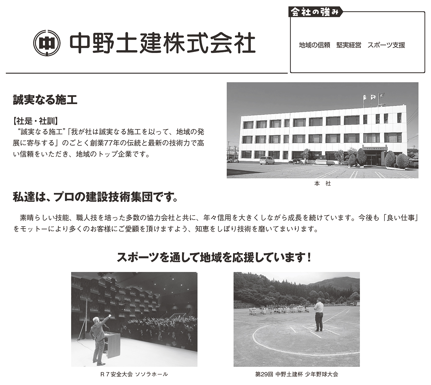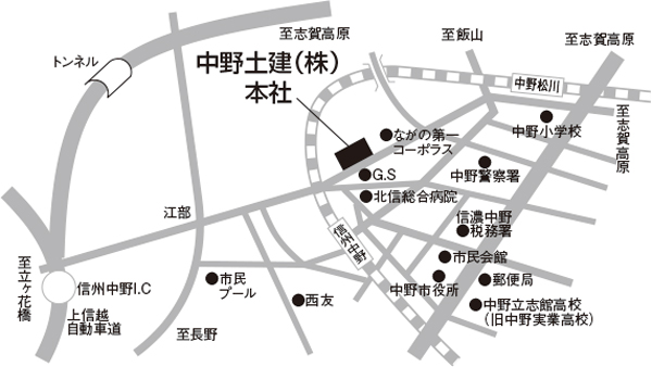| 所在地 | 本社 長野県中野市西2丁目5番11号 長野現場事務所 長野市栗田1038-8ゆたかビル204号 飯山現場事務所 長野県飯山市大字下木島182 山ノ内現場事務所 長野県下高井郡山ノ内町大字平穏4106 飯綱現場事務所 長野県上水内郡飯綱町大字普光寺500-1 |
